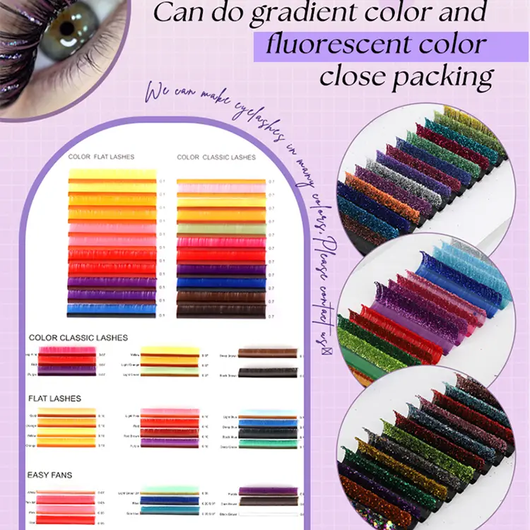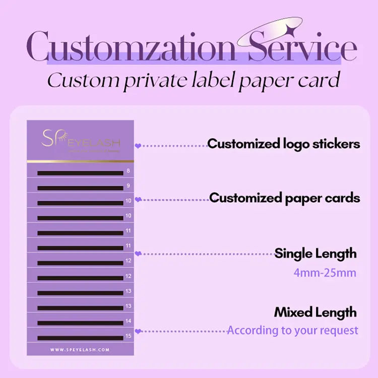 K dispozici v osmi úrovních tloušťky od 0,03 do 0,25 mm, spárovaného s J/B/C/CC/D/L/M/LM Osm typů kombinací poloměru curlingu. Speciální design oční křivky kombinované s biomimetickými vlákny textury splňuje plné potřeby stylu scény od denního holého make -upu po těžký make -up banket.