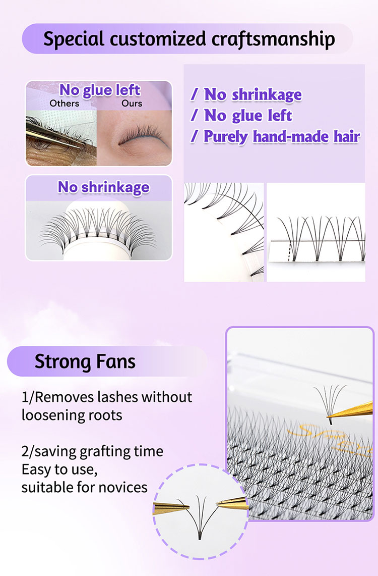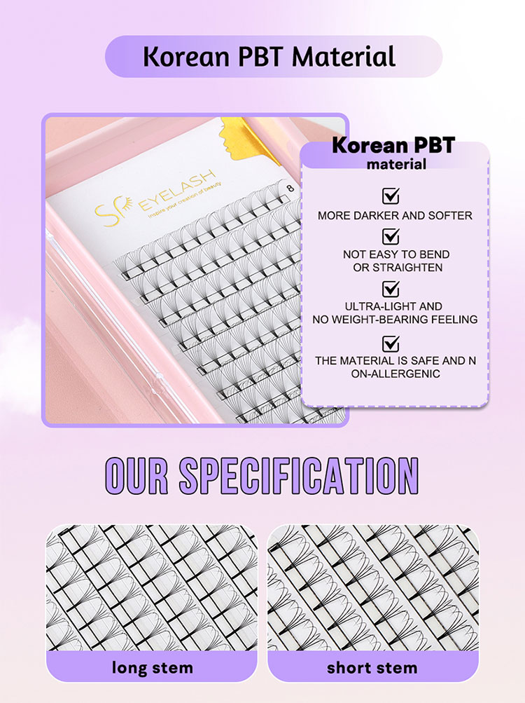 Ručně vyrobené z prémiového korejského PBT hedvábí, tito premade fanoušci 10d poskytují měkký, přirozený pocit. Ultra-Dark povrch přidává hloubku a drama, zatímco ultratenké, silné a odolné základny zajišťují bez námahy vyzvednutí a aplikaci. Tato kombinace materiálů vytváří luxusní a spolehlivý produkt.
