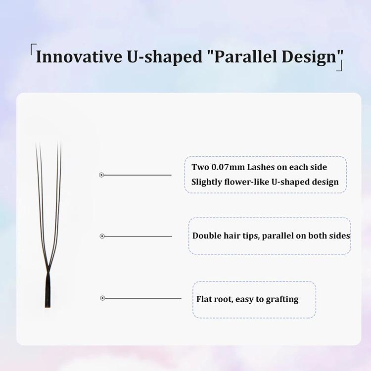Dvojitý špičatý design ve tvaru písmene U zvyšuje kontaktní body lepidla, zvyšuje pevnost a trvanlivost a má ve srovnání s tradičními řasami ve tvaru Y.
